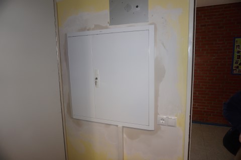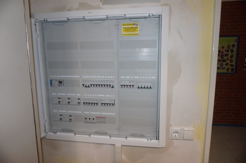 Aufgabenstellung: Erneuerung der Sprechanlage gegen eine moderne Videosprechanlage. Austausch der Verteilung Verwaltung. Ausleuchten der Schulwerbebanner durch LED-Strahler.